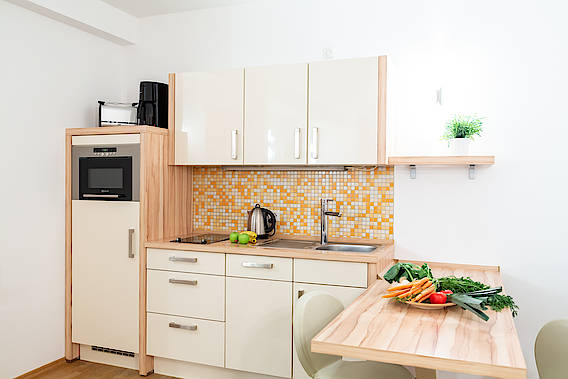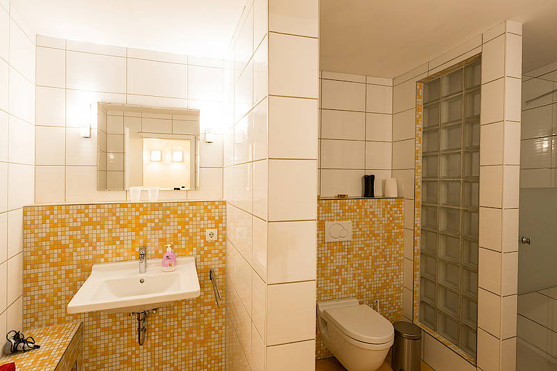 Die moderne Ferienwohnung liegt in einem Neubau in einem Hinterhaus. Sie haben ein Bad mit Dusche, WC, Waschbecken, Flur. Weiterhin gibt es eine offene Küche mit komplett eingerichteter Küchenzeile mit Kühlschrank, Spülmaschine, ausreichend Geschirr, Gläser, Besteck, Töpfe uvm.