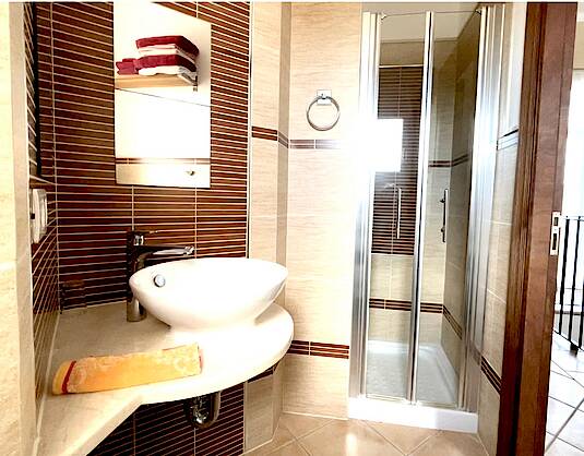 Upstairs, there is the master bedroom (bed 200x18) with en-suite bathroom, the second bedroom (bed 200x160) with access to the adjoining large roof terrace, a second small shower room, a gallery with a sofa bed, a second large roof terrace, and a balcony.