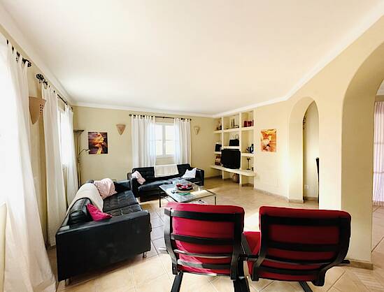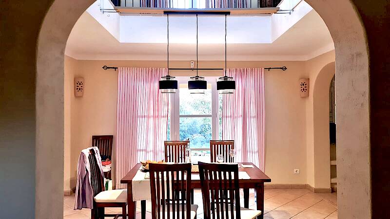 On the ground floor, in addition to the large covered terrace, the house also features a large living room with two sofas and two armchairs, a dining room with a gallery, a well-equipped kitchen, and a guest toilet.