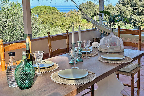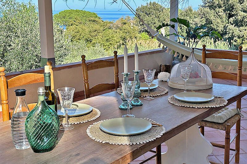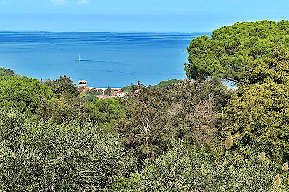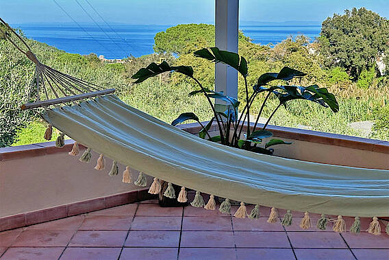 Von der 50 m² großen Wohnterrasse hat man einen wunderschönen Blick Richtung Meer und Marciana Marina.