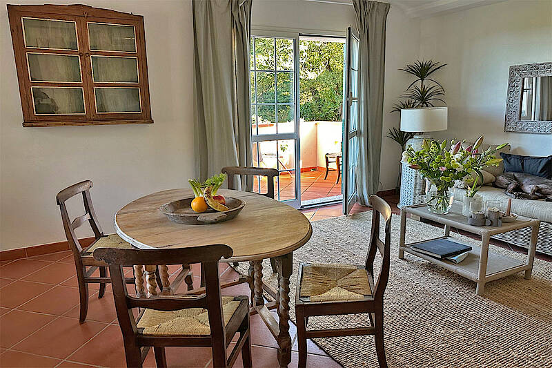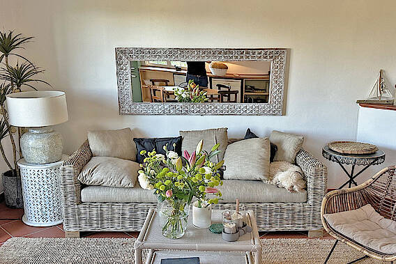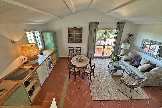 Die Wohnung befindet sich im oberen Hausteil – der untere Hausteil wurde noch nicht ausgebaut- und bietet einen großen Wohnraum mit Kamin und mit Kuchenzeile und Esstisch, sowie eine weitere möblierte Terrasse Richtung Meer.