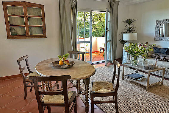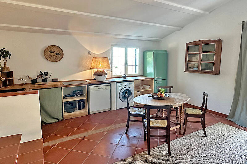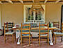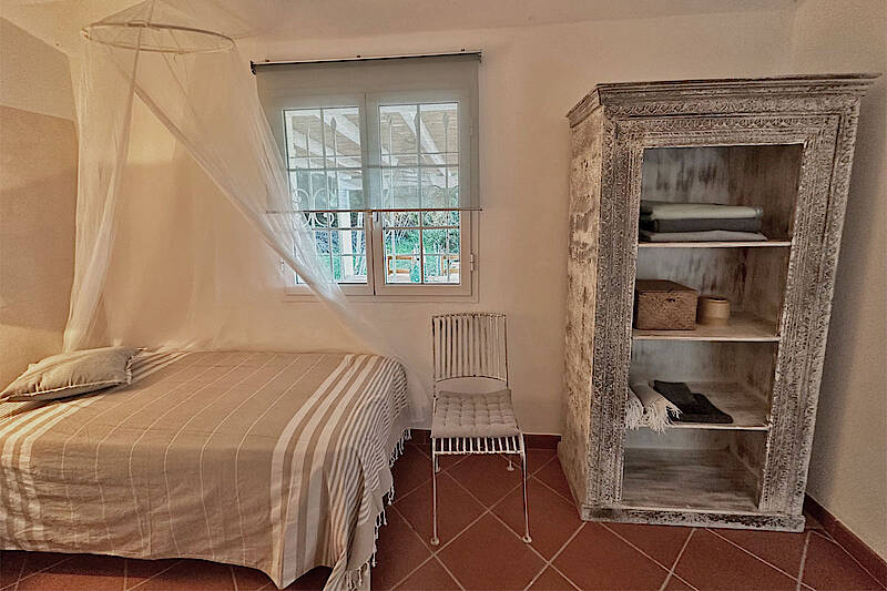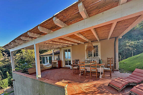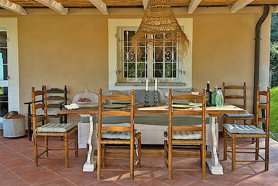 Das große Grundstück besteht zum größten Teil aus Mediterranen Pflanzen, Olivenbäumen und Wiese und bietet verschiedene Sitzecken. Das Rauschen des Baches versiegt nur Mitte Juli und August.