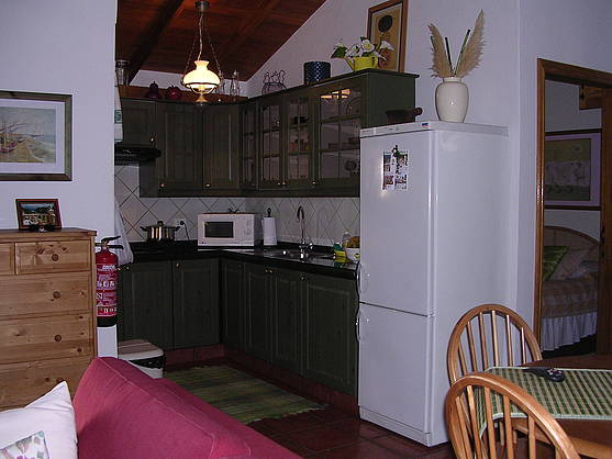 One bedroom with double bed + double sofa-bed in the lounge. * Lounge/diner, kitchen, bathroom, terrace, duvets, towels, fridge, microwave, heating, toaster, TV and washing machine. * Rustic style furniture