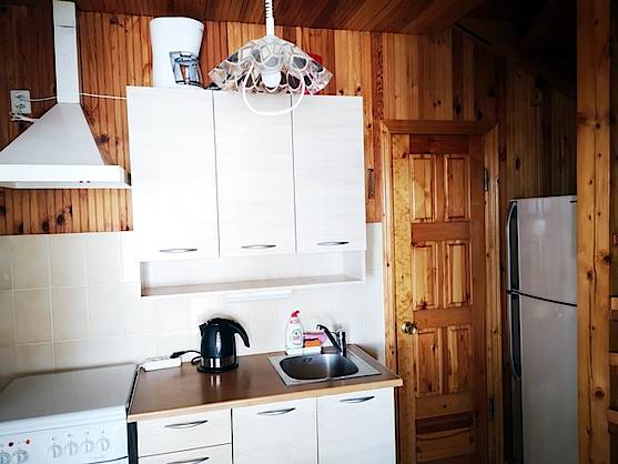 * dem Erdgeschoss: Wohnzimmer mit Kamin und Sat.TV, Schlafzimmer mit einem Doppelbett (Bettwäsche), Küche (Geschirr, Elektroherd, Kühlschrank, Mikrowelle, Kaffeemaschine, Wasserkocher), DU/WC (Handtücher, Haartrockner, Bügeleisen mit Bügelbrett), Veranda.