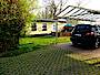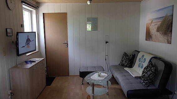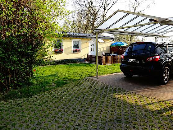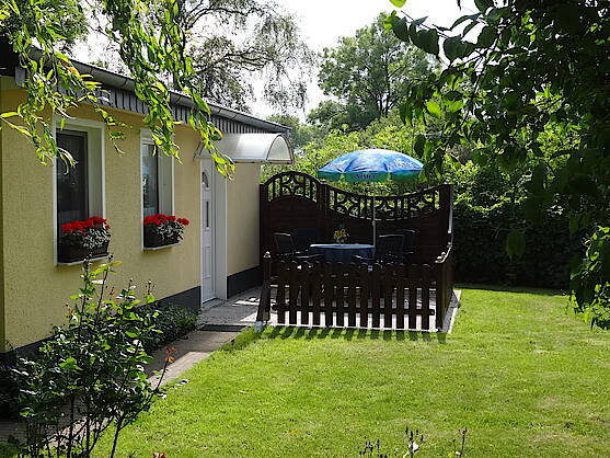 Der etwas abseits stehende Bungalow ist ungefähr 40 qm groß und grenzt an eine Wiese mit einigen Büschen und Bäumen.