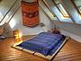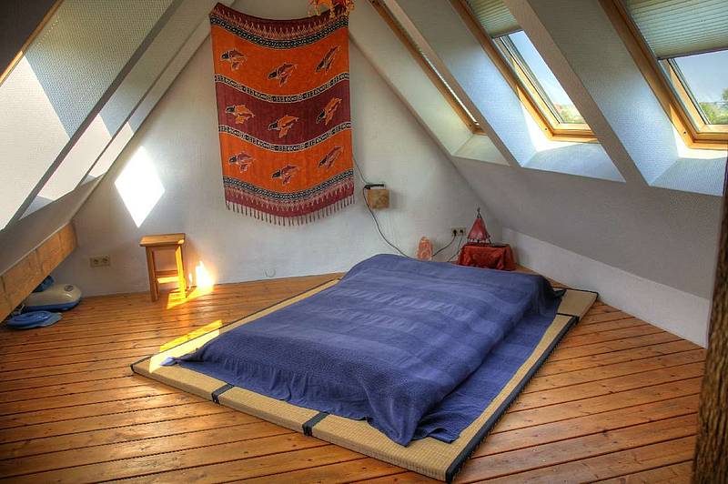 open sleeping loft above the living room with Japanese futon