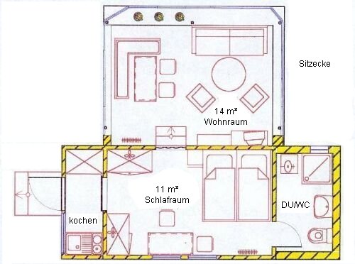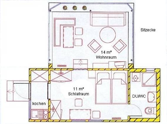Ferienhaus für 2 Personen. 2 Aufbettungen sind möglich. Vermietung von Ende April bis Anfang Oktober.