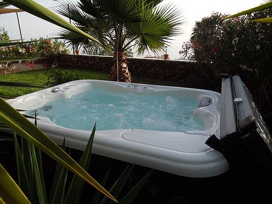 Die Rundum-Terrasse mit individuellen Sitzgruppen und Sonnenliegen lädt zu jeder Tageszeit zum Relaxen, Essen und Genießen ein. Das Highlight des Gartens ist der Jacuzzi, in dem sich unsere Gäste abends bei einem Bad entspannen können. Die Benutzung des Whirlspools ist inklusive.