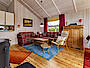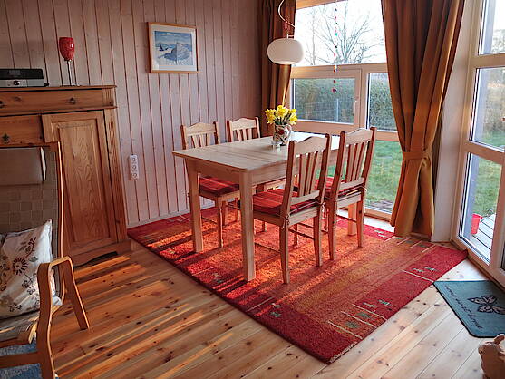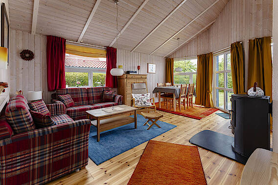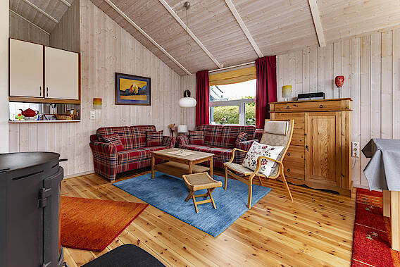 Das Ferienhaus ist in Holzbauweise errichtet, verfügt über Panoramafenster, holzverkleidete Innenwände/Dachschrägen. Der Fußboden ist aus geölten Dielen. Die Einrichtung ist komfortabel und gemütlich. Im großen Wohnraum steht ein Kaminofen (mit Holz/Holzbriketts zu beheizen).
