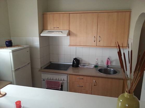 Das Apartment verfügt über eine Küche mit Elektroherd und Ceran-Kochfeld sowie einem Kühlschrank, die für den notwendigen Komfort sorgen.