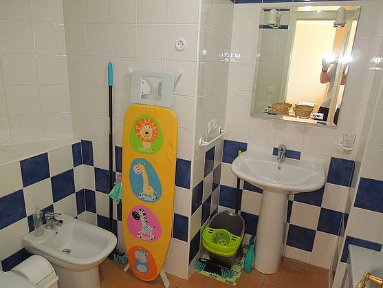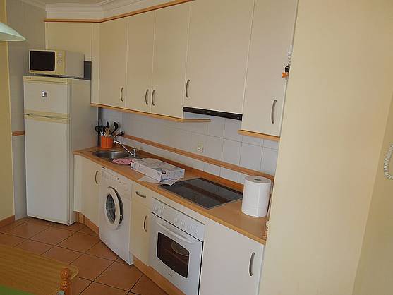 Das gemütliche Wohnzimmer hat einen Flachbild-Fernseher mit Satelliten-Programmen. Daran grenzt die Küche an, die komplett ausgestattet ist mit Elektroherd mit Cerankochfeld, Backofen, Mikrowelle, Kaffeemaschine, Wasserkocher und allen Kochutensilien, die man für einen komfortablen Urlaub braucht. Außerdem gibt es ein helles Badezimmer mit Dusche und Waschmaschine. Die Terrasse, die zur Poolseite ausgerichtet ist.