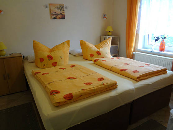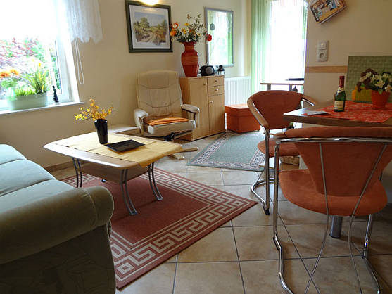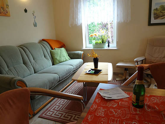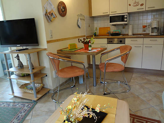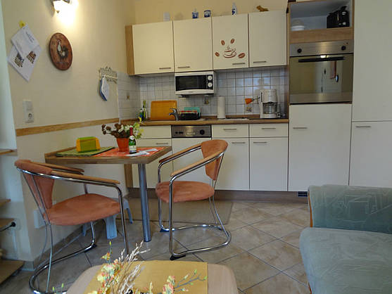 Die Ferienwohnung - Oben verfügt über ein Schlafzimmer mit Doppelbett und ein Schlafsofa zur weiteren Aufbettung im Wohnzimmer. Der einladende Wohnbereich unserer Ferienwohnungen ist mit einer gemütlichen Sitzecke sowie Sat-TV, Radio und Internetanschluss (inkl. WLAN) ausgestattet. Die kleine Küche schließt offen an das Wohnzimmer an und beinhalten neben Sitzgelegenheiten und einem kleinen Tisch auch einen 2-Platten-Herd, Kühlschrank, Backofen, Spülmaschine, Mikrowelle, Wasserkocher, Toaster, Kaffemaschine und Eierkocher. Vervollständigt werden die beiden Ferienwohnungen durch je ein komfortables Badezimmer mit Dusche und WC. Preis pro Tag für 2 Personen für Bettwäsche, Handtücher, Strom, Wasser, Heizung. Parkplatz & Fahrräder sind kostenfrei !