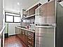 The kitchen has a marble countertop, a large refrigerator with freezer, a microwave, a stove with four burners and oven,