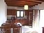 The large kitchen has a seating area with two sofas (one to use as a sofa bed), coffee table, dining table with 4 chairs, a complete kitchen with wood decor.