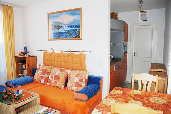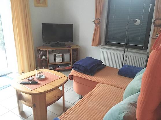 Die ebenerdige Fewo orange-blau ist 30 qm groß und für 2 Personen (4-Sterne) optimal. Von der Terrasse gelangen Sie in den Wohnbereich, in dem sich auch die komplett eingerichtete Einbauküche und der Essbereich offen zum Wohnzimmer befindet. Das separate Schlafzimmer mit Boxspringbett 180x200cm, Kleiderschrank und das Badezimmer mit Dusche/WC und vielen Annehmlichkeiten (Föhn, Kosmetikspiegel, Toilettenpapier uvm.) befindet sich im hinteren Teil der Ferienwohnung.