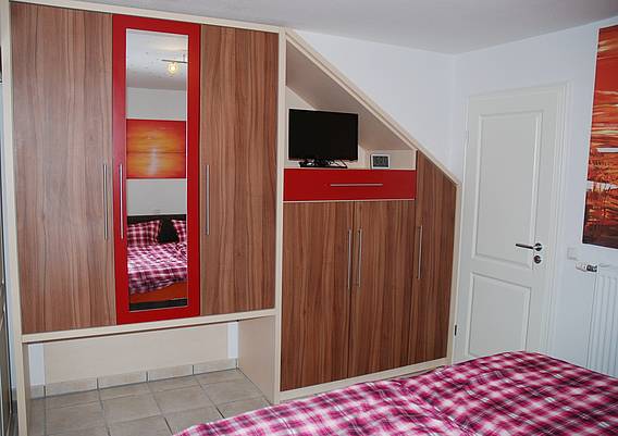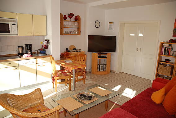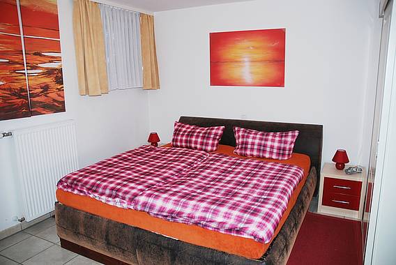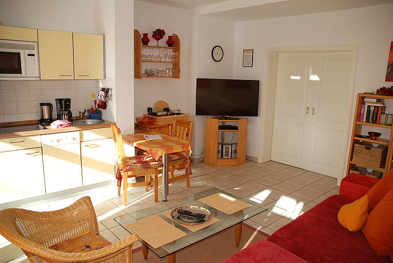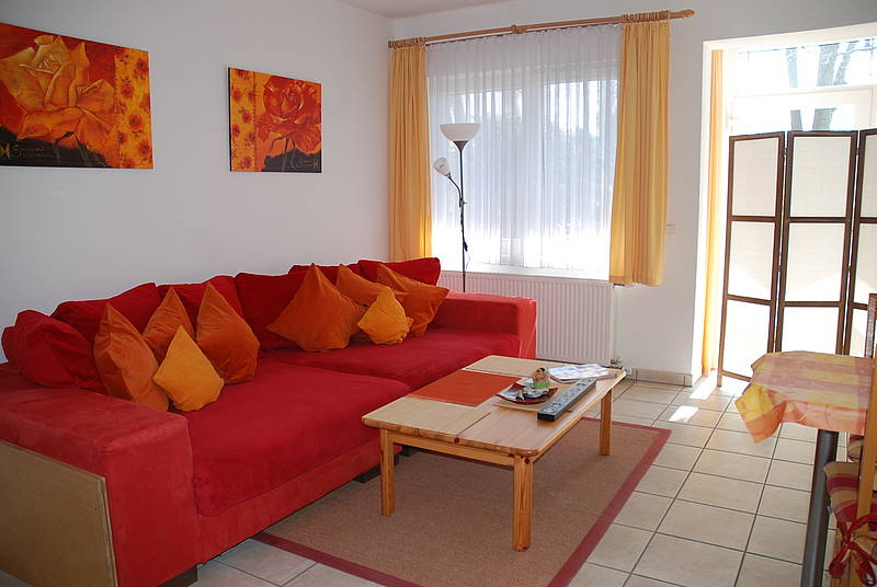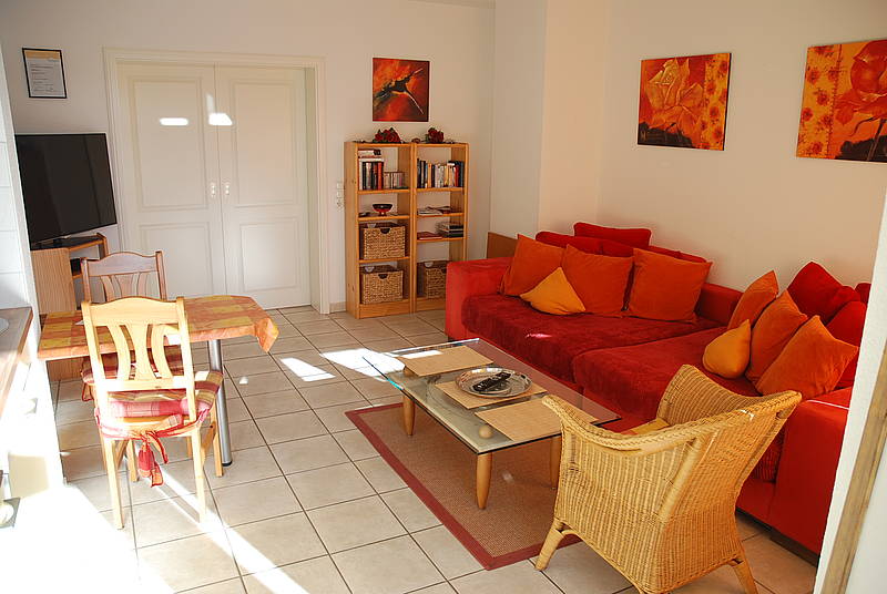 Von der Terrasse gelangen Sie in den Wohnbereich, mit rotem xxl-Sofa. Im Wohnbereich befindet sich auch die Einbauküche (Komplettausstattung) und der Essbereich. Das separate Schlafzimmer mit Doppelbett, Kleiderschrank und das Badezimmer mit Dusche/WC und vielen Annehmlichkeiten (Fön, Kosmetikspiegel, Toilettenpapier uvm) befindet sich im hinteren Teil der Ferienwohnung. Stubenreiner und artiger Hund erlaubt.